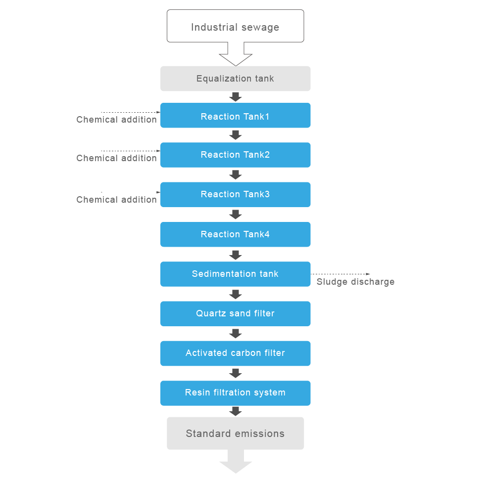 Mejec-JM-IWTPは、産業排水に含まれる重金属イオンを標的として除去するために特別に設計された高度な物理化学プロセスを採用しています。効率的な沈殿と精密な固液分離を組み合わせることで、溶解した金属(銅、亜鉛、クロムなど)を不溶性の沈殿物に変換し、その後ろ過して除去します。これにより、電気めっきおよび金属加工産業からの排水は、水質の安全性を確保しながら、厳格な環境排出基準を満たすことができます。
